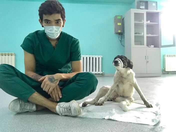 И это не единственный уникальный случай спасения животных. Как-то к ним доставили пса, пострадавшего от наезда автомобиля. Как признается Алдияр, шансов на удачный исход практически не было: позвоночник животного был раздроблен, но благодаря умелым действиям врачей через месяц животное могло отталкиваться лапами на коляске, а через четыре начало ходить самостоятельно.
