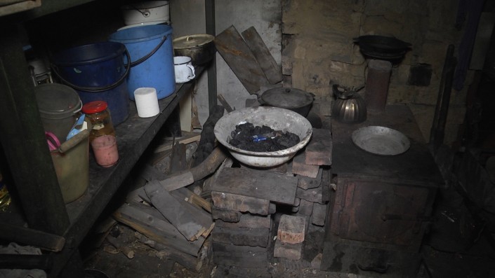В гараже нет никаких коммунальных благ. Электричество мужчине заменяют керосинка или аккумулятор, воду привозит. Тут же стирает и сушит вещи. Дрова собирает на улице, уголь покупает мешками или заказывает машину. Пристроил углярку к гаражу. Печку нужно топить каждые три часа, больше тепло не держится. На печке же и готовит.
