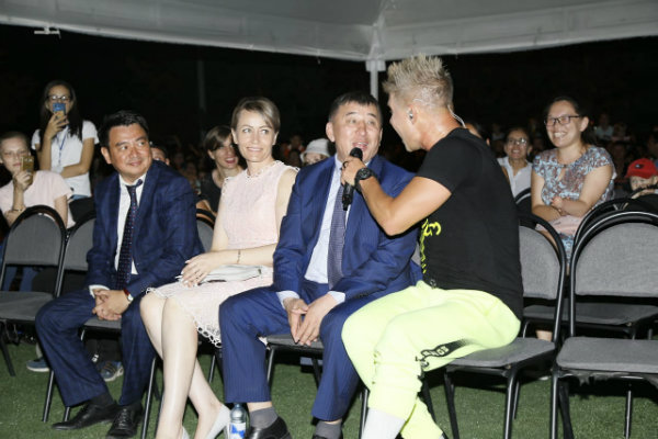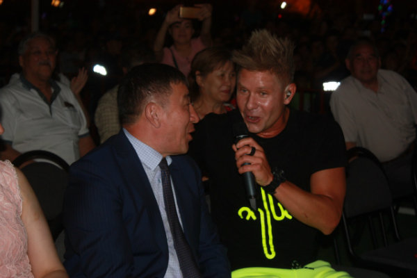 В какой-то момент он подошел к палатке, где сидели специальные гости и аким города Кайрат Ахметов. Артист в этот момент исполнял песню "Все будет хорошо" и дал пропеть припев акиму.