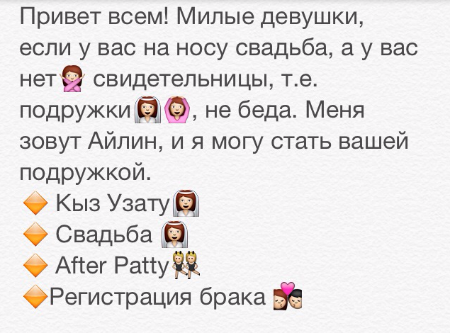 В социальной сети "ВКонтакте" появилось объявление от девушки, проживающей в Алматы. Она предлагает услуги по сопровождению на любые торжества. По словам девушки под псевдонимом Айлин, идея ей пришла из-за того, что ее друзья очень часто просят сходить с ними на торжественные мероприятия.