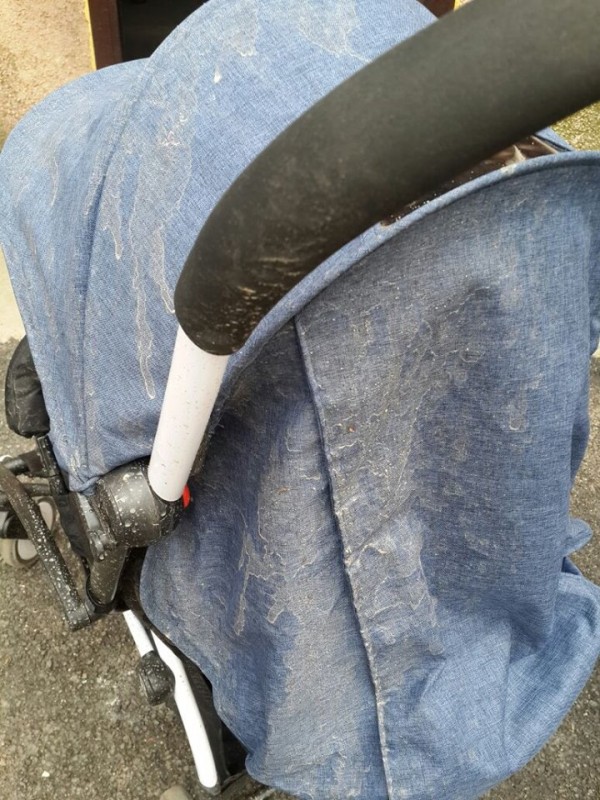 "Водитель "поливалки" с гос.номером A 956 HP проезжая по тротуару специально (изначально ехал не включая поливалку, увидев маму с коляской включил струю воды, чтобы произвести впечатление на сидящую рядом с ним женщину, они оба смеялись громко) облил с ног до головы грязью мою маму (ей 64 года!) и моего сына в коляске (ему 8 месяцев). Результат вы видите на фото. Грязная коляска, грязное пальто и одежда мамы и ребенка. Также мама была в испуганном состоянии, а ребенок плакал без остановки", - написал Марат Шакен (орфография автора сохранена), отметив акимат Алматы и ДВД Алматы.