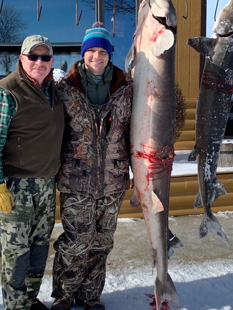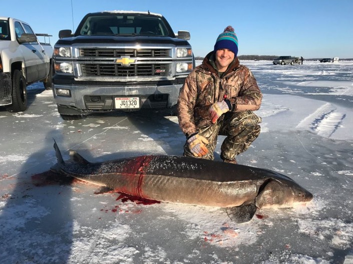 Огромного осетра поймали во время подледной рыбалки американец Джон Эйден и его отец в штате Висконсин, сообщает National Geographic.