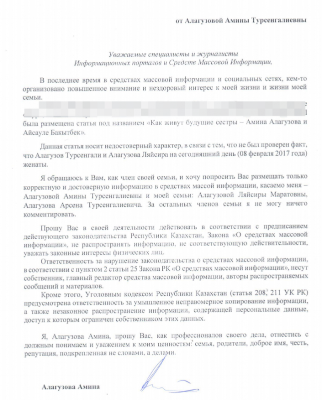 Дочь Турсенгали Алагузова Амина обратилась к СМИ с заявлением, передает Tengrinews.kz.