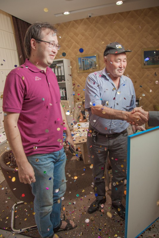 Генеральный директор BI Development Almaty Айдос Мукатаев рассказал о подготовке розыгрыша: "Поздравление от нашей команды стало сюрпризом ‒ отец и сын до последнего ни о чем не догадывались. Мы пригласили их в центр продаж якобы для того, чтобы исправить неточности в договоре, но на деле ‒ разыграли".