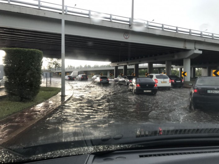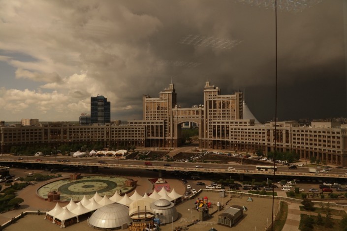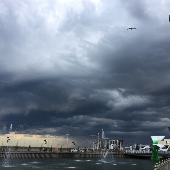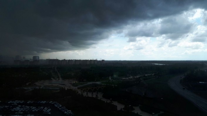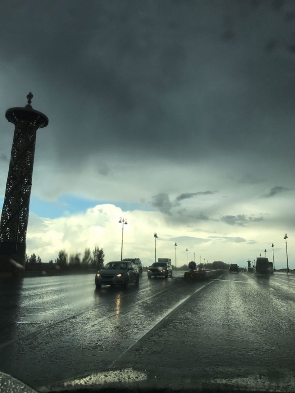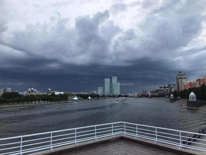 С утра в разных частях столицы можно было наблюдать разную погоду. Если на левобережье надвигались тучи и ожидался дождь, то на правом берегу Астаны была ясная и солнечная погода. Уже ближе к полудню центр столицы накрыли густые, черные тучи.
