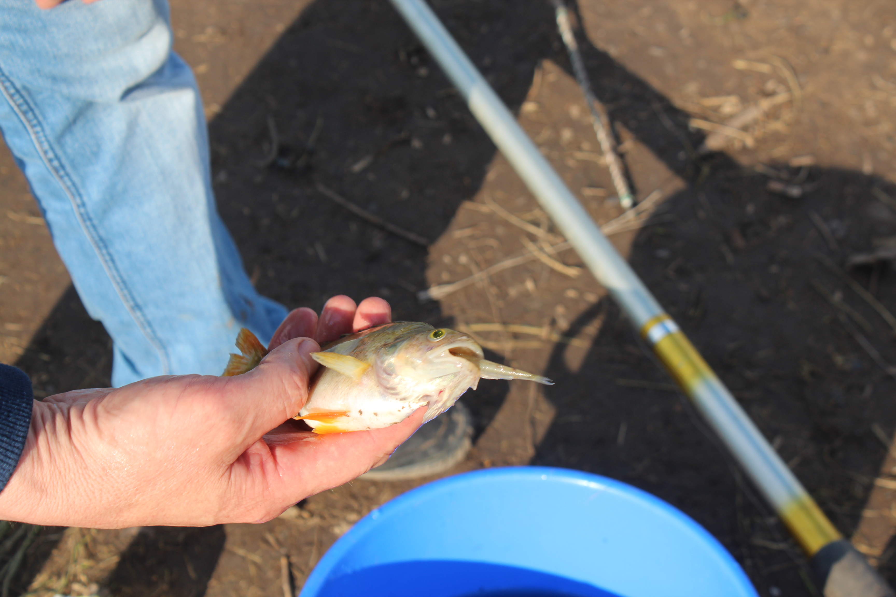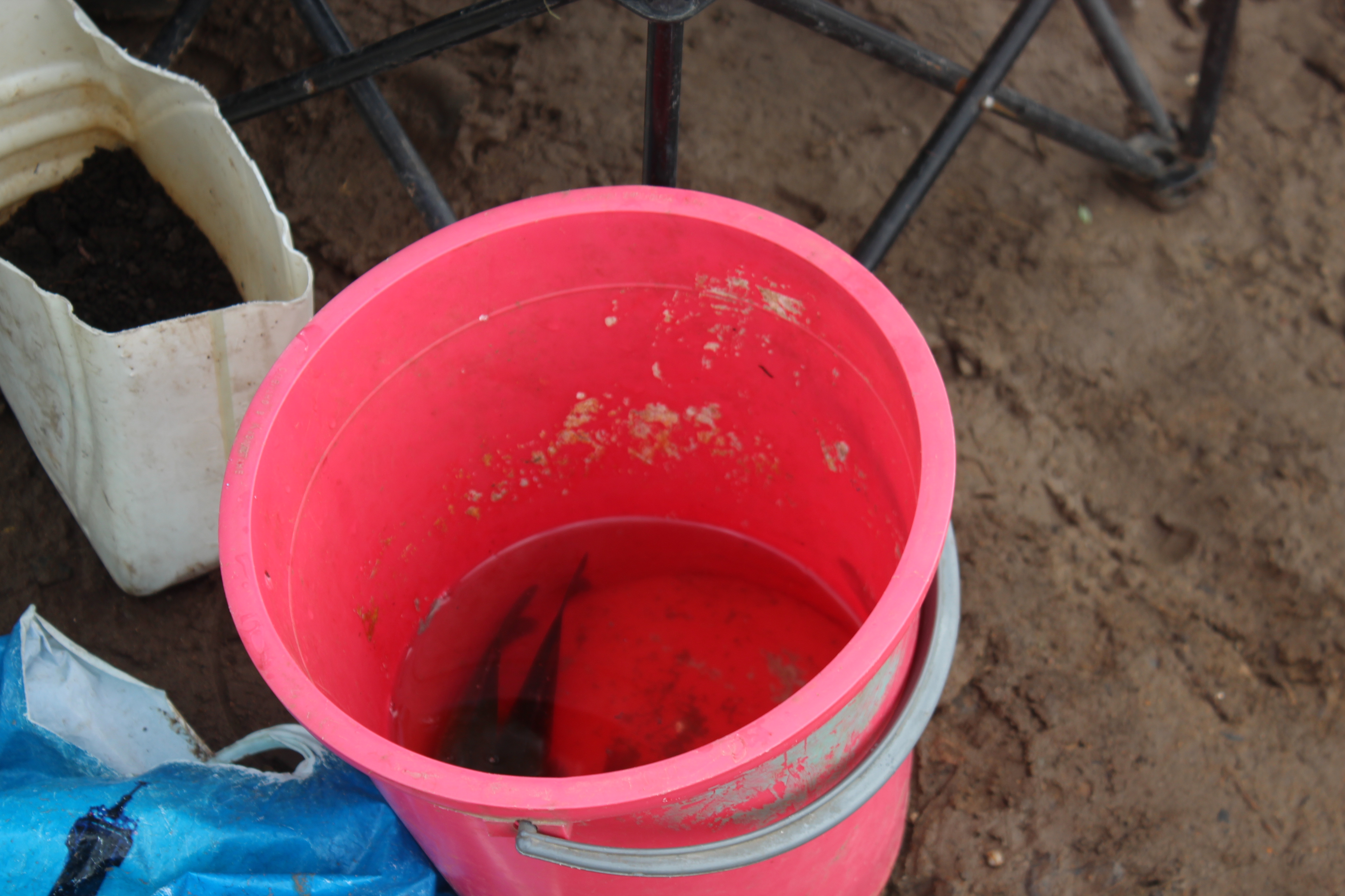Эта пойманная рыба скоро отправится на сковородку, но это не помешало ей, плавая в ведре, заглотнуть малька.