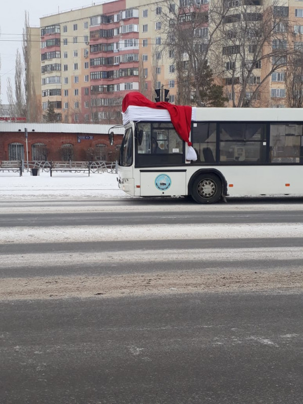 Маршрутный автобус в новогодней шапке появился в Павлодаре, передает корреспондент Tengrinews.kz.