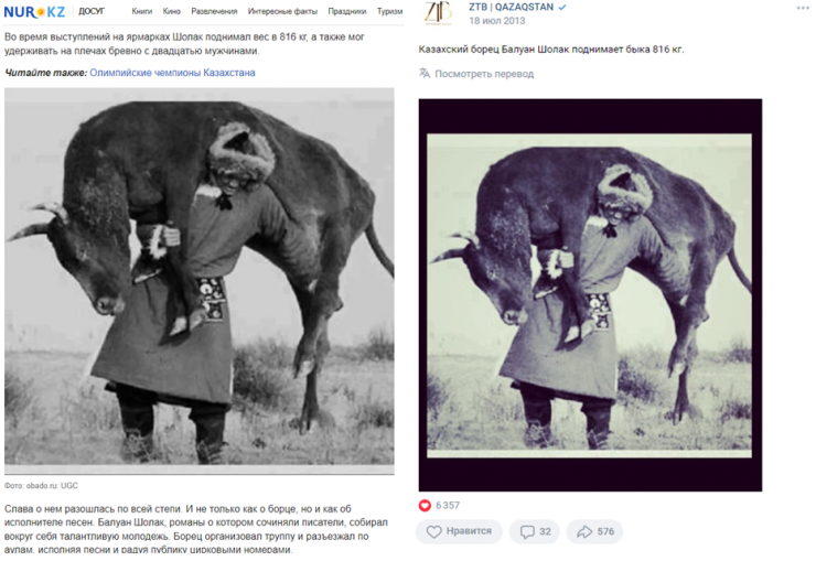 Жаңалық сайттарында, Желідегі ZTB парақшасында және суреті желіде жарияланған стендтерде де осындай екі сурет бірнеше рет жарияланған. Біріншісіне тоқталайық. Мұнда ер адам өгізді көтеріп тұр.