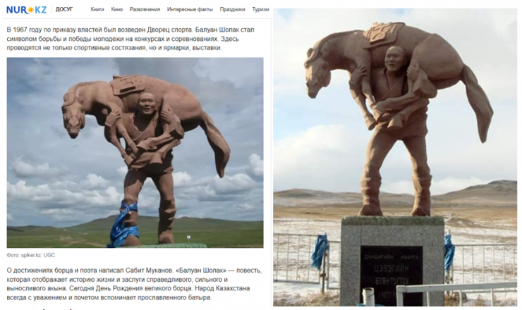 Ал екінші суреттегі ескерткіште де Балуан Шолақ бейнеленбеген. Жылқыны көтеріп тұрған суреттегі ескерткіш қазақ палуанының құрметіне қойылмаған. Алайда мұнда да екіұшті мәселемен бетпе-бет келеміз. Бұл ескерткішке қатысты тывалықтар мен моңғолиялықтар өз батырына орнатылған деген талас пікір айтады.