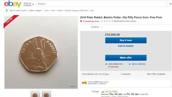 На семиугольных монетах изображены персонажи сказок Поттер. На момент выпуска каждый набор, состоявший из нескольких 50-пенсовых монет, стоил 55 фунтов (около 60 долларов). Тираж разошелся всего за восемь дней, после чего монеты начали продавать на интернет-аукционах.