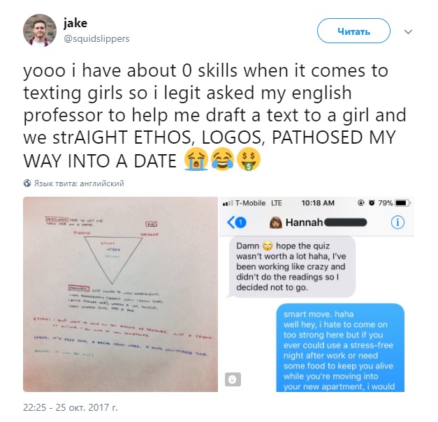 Как рассказал Джейк, он хотел пригласить девушку по имени Ханна на ужин, однако не знал, как правильно это сделать. Тогда парень попросил помощи у профессора университета, который посоветовал прибегнуть к методике убеждения и использованию риторических категорий - этоса, пафоса и логоса. Вместе с преподавателем они изучили жизнь Ханны и заметили, что она переезжает в новую квартиру, много работает, любит китайскую еду и у нее есть собака.