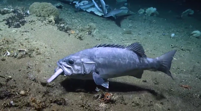 Ученые из Национального управления океанических и атмосферных исследований США запечатлели на камеру, как огромный морской окунь практически целиком заглатывает небольшую акулу. Видео исследователи разместили на своей странице в Facebook.