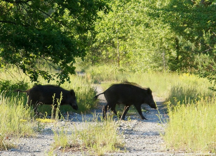 Фото кабанов опубликовано на странице Чернобыльского радиационно-экологического биосферного заповедника в Facebook. В объектив фотографа попали две особи, которые в пустынной и покрытой буйной растительностью местности переходят заросшую травой дорогу.