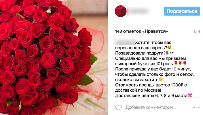 "Хотите, чтобы вас поревновал (приревновал - ред.) ваш парень? Позавидовали подруги? Специально для вас мы привезем шикарный букет из 101 розы. После приезда у вас будет 10 минут, чтобы сделать столько фото и селфи, сколько вы захотите", - говорится в описании услуги.