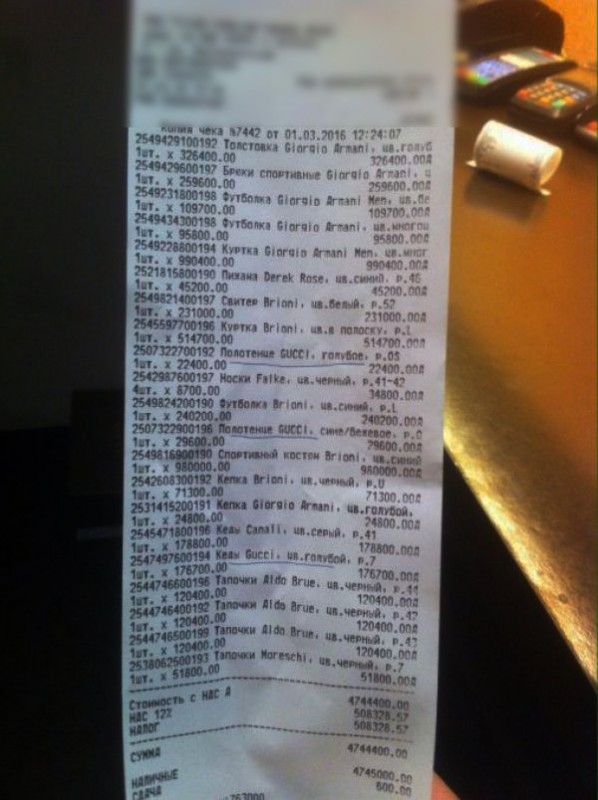 Отметим, что в социальных сетях бурно обсуждается чек из люксового магазина Алматы. Согласно фискальному документу - покупатель совершил за один раз покупку одежды почти на пять миллионов тенге. В частности, в списке значатся полотенце Gucci за 29 600 тенге, тапочки за 120 400 тенге , футболка Armani за 95 тысяч тенге и прочие мужские принадлежности.