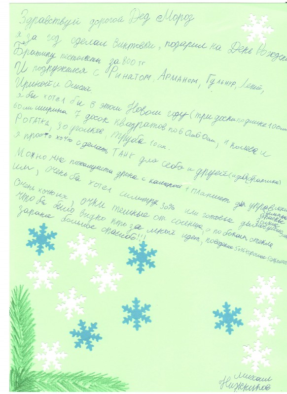 В письме Деду Морозу Аружан попросила зимнюю одежду - куртку, джемпер, спортивный костюм и кроссовки. Еще девочка попросила куклу. И дедушки морозы в лице волонтеров уже исполнили детскую мечту.