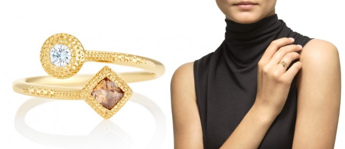 Кольцо из желтого золота - яркий представитель этнической коллекции Talisman. Камни установлены в пазы по новаторской методике, благодаря которой бриллианты "поднимаются над поверхностью", радуя завораживающим блеском. В украшении два камня: тонкий круглый прозрачный натуральный бриллиант и матовый необработанный природный алмаз коньячного цвета. Общий вес камней - 0,3 карата. Сочетание обработанных и необработанных алмазов - отличительная черта коллекции Talisman, еще раз подтвердившей новаторскую славу бренда De Beers.