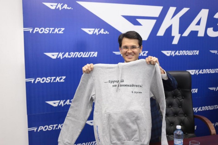 "Спасибо команде "Казпочты" за подарок! Весьма оригинально. Подарили кофту с надписью одной из моих часто используемых фраз "Ерундой не занимайтесь!". Ну и очень весело встретили нового руководителя Сарсенова Сакена, вручив форму почтальона", - написал Мусин на своей странице в Facebook.