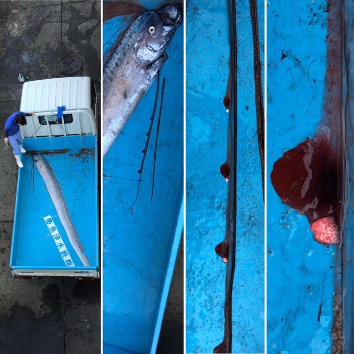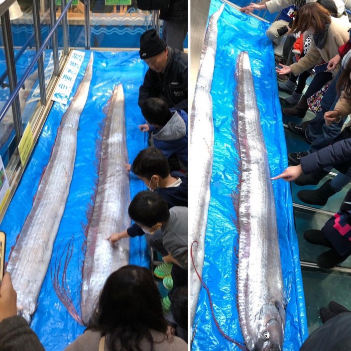 Японские пользователи соцсетей забили тревогу, узнав, что в течение десяти дней сразу три ремнетела ("сельдяных короля") выбросились на берег в префектуре Тояма. Одна из рыбин достигала четырехметровой длины, другая - 3,2 метра.