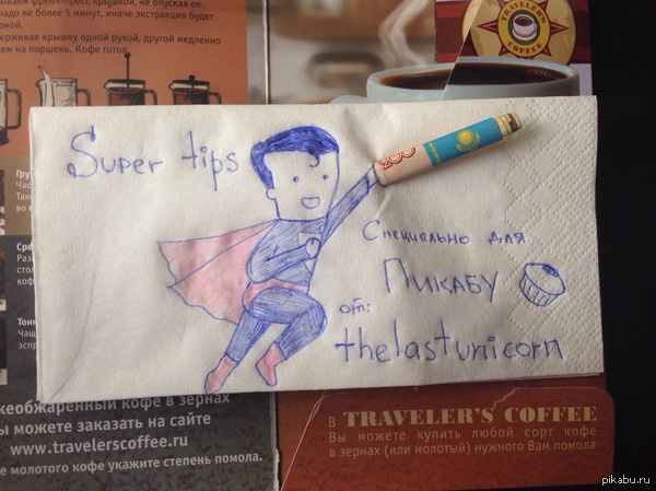 Свои чаевые девушка оформляет рисунками популярных героев комиксов и мультфильмов. "На них уходит, наверное, минуты две, не больше", - говорит автор. Жангирбаева сообщила, что официанты положительно реагируют на такие картинки и даже их коллекционируют. Она отметила, что выбрала самые простые для понимания фразы на английском языке.