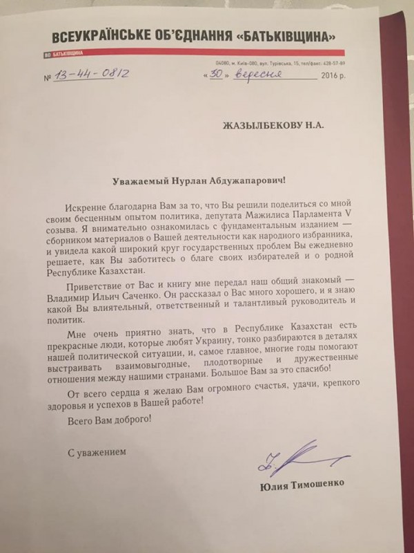 По словам Нурлана Жазылбекова, две недели назад он отправил свою книгу "Сборник материалов депутата Мажилиса Парламента РК V созыва" руководителю партии "Всеукраинское объединение "Батькивщина" Юлии Тимошенко. Она, в свою очередь, написала ему благодарственное письмо. Фотографию письма Нурлан Жазылбеков опубликовал на своей странице в Facebook, подписав следующее:
