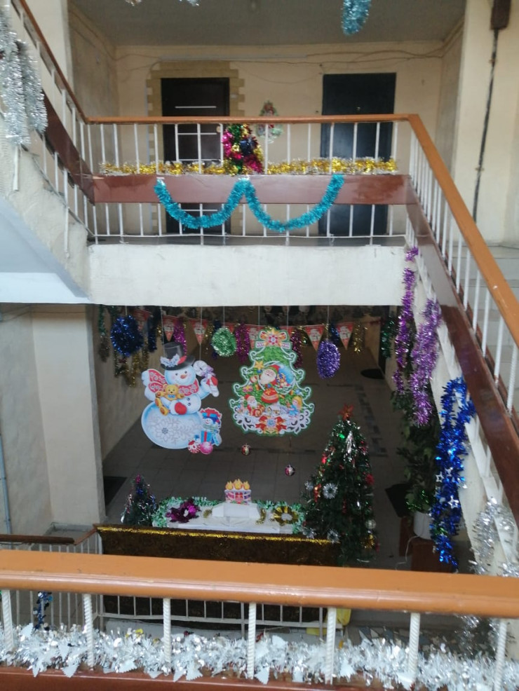 Жильцы дома № 72/2 по улице Гагарина украсили свой подъезд общими усилиями. По словам главного инициатора - пенсионерки Шарипы Рымбаевой, подготовку к Новому году они начали сразу после Дня независимости. Жильцы дома не первый год украшают свой подъезд, поэтому им не пришлось сильно тратиться. Многие украшения остались с прошлых лет.