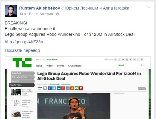 Основатель стартапа Robo Technologies Рустем Акишбеков на своей странице в Facebook заявил, что продал свое изобретение компании Lego за 120 миллионов долларов. Новость он подкрепил ссылкой на материал TechCrunch. При более детальном рассмотрении оказалось, что публикация не настоящая и размещена на сервисе по созданию клонов популярных сайтов. Стоит отметить, что несколько СМИ поверили розыгрышу Акишбекова.