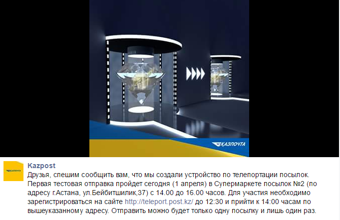 "Казпочта" 1 апреля представила свою новую разработку - теперь они телепортируют посылки.