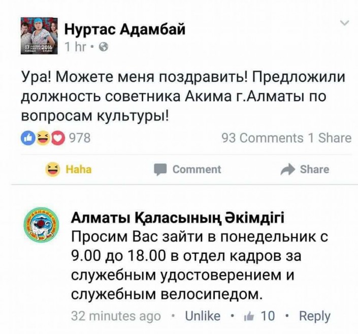 Актер и режиссер Нуртас Адамбай в День смеха стал советником Бауыржана Байбека по вопросам культуры. Акимат Алматы отреагировал быстро - автору "Келинки Сабинки" уже приготовили служебный велосипед.