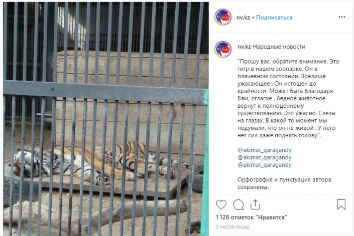 В пресс-службе городского акимата сообщили, что в карагандинский зоопарк амурский (уссурийский) тигр по имени Немо прибыл из Ташкента в 2009 году. В природе такие животные живут около 15 лет, в неволе - до 20 лет.