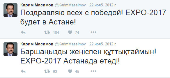 Примечательно, что с последней записи, которую в социальной сети сделал Масимов, прошло четыре года. Тогда премьер-министр поделился с пользователями хорошей новостью - Астана выиграла право на проведение выставки EXPO-2017.