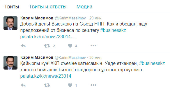 Премьер-министр Казахстана Карим Масимов спустя четыре года вновь стал делать записи в Twitter, сообщает Tengrinews.kz