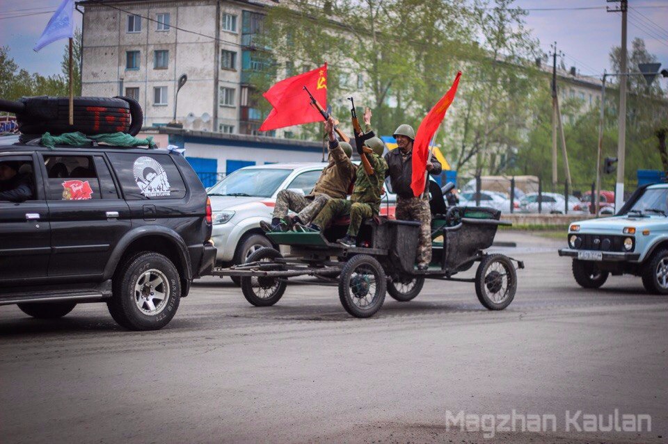 В Петропавловске День Победы встретили автопробегом. Машины украшали праздничными лентами и флагами. Некоторые повесили на авто бутафорские танковые башни и пулеметы.