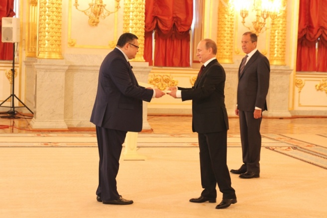 Вот, например, фото вручения верительных грамот президенту России Владимиру Путину послом Казахстана в РФ Маратом Тажиным.