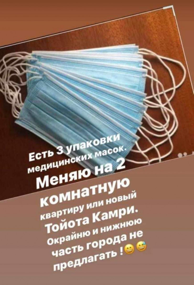"Үш бума медициналық маска бар. Екі бөлмелі пәтерге немесе жаңа Toyota Camry-ге ауыстырамын. Қаланың шетіндегі үйлерді ұсынбай-ақ қойыңыздар"