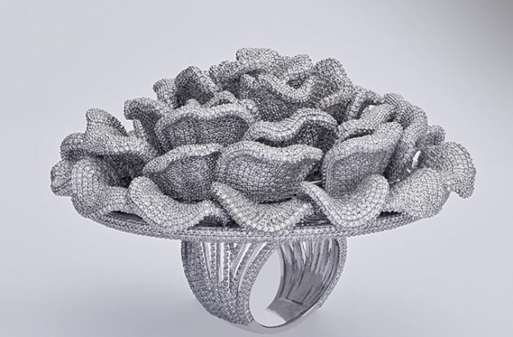 Изделие индийской ювелирной компании содержит 24 679 бриллиантов. Создание кольца началось с его дизайна, за основу которого команда решила взять розовый гриб вешенку. Чтобы добиться желаемого дизайна, прототип кольца сначала был создан с помощью пластиковой формы, а затем воссоздан в цифровом формате.