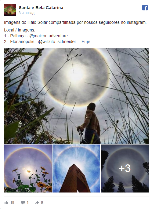 Жители бразильского штата Санта-Катарина наблюдали оптический феномен гало, передает РИА Новости.