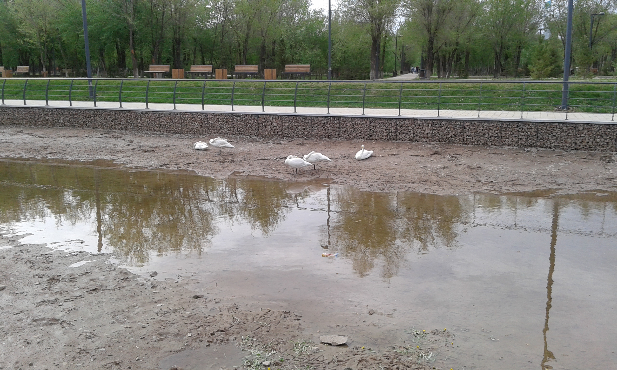 В минувшие выходные жители и гости Астаны, посетившие столичный парк, могли стать свидетелями неприятной, вызывающей жалость картины. Пруд с лебедями был практически осушен, птицам оставили лишь неглубокий ручеек, больше похожий на лужицу, сообщает корреспондент Tengrinews.kz.