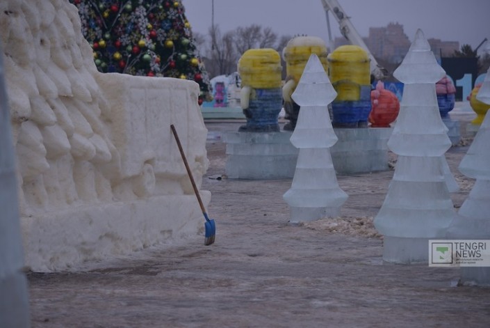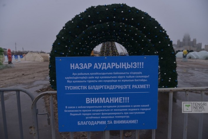 По словам другого сотрудника, ледовый городок был закрыт по решению властей города. "Акимат сказал, и нас закрыли в связи с тем, что все тает. Конструкции тают и в любое время могут на кого-то рухнуть. Эти фигуры из льда же. Они не упадут сейчас, конечно, но зачем нам гадать. Погода видите какая. Как морозы придут, работы закончим сразу. Лед привозят. Машина по изготовлению льда работает, а искусственный снег пока не делается", - рассказал другой рабочий по имени Данат.