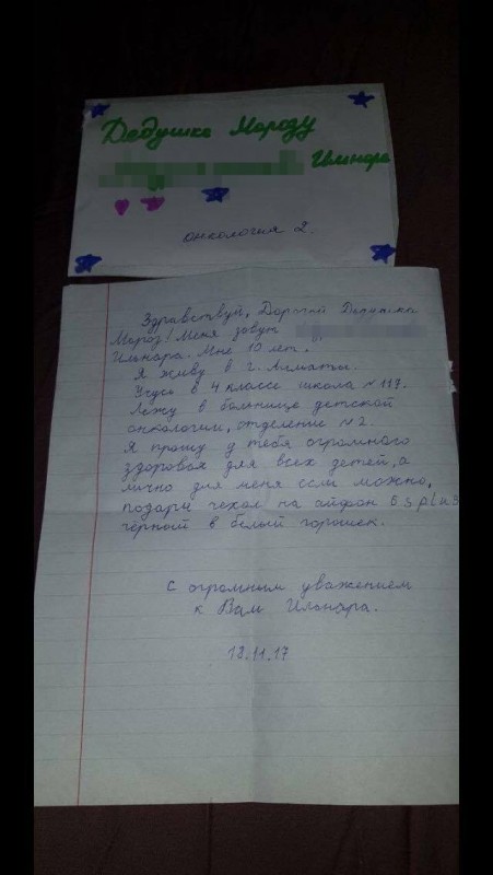 В Казахстане стартовала акция "Я - Дед Мороз! Я - Снегурочка!". Инициаторы проекта - команда "#Я рядом" - получили более 600 писем от онкобольных детей и детей с диагнозом ДЦП. По их словам, большинство малышей просили подарить игрушки, одежду, велосипеды, но были и те, кто нуждается в лекарствах и препаратах. Редакция Tengrinews.kz собрала несколько детских посланий Деду Морозу.