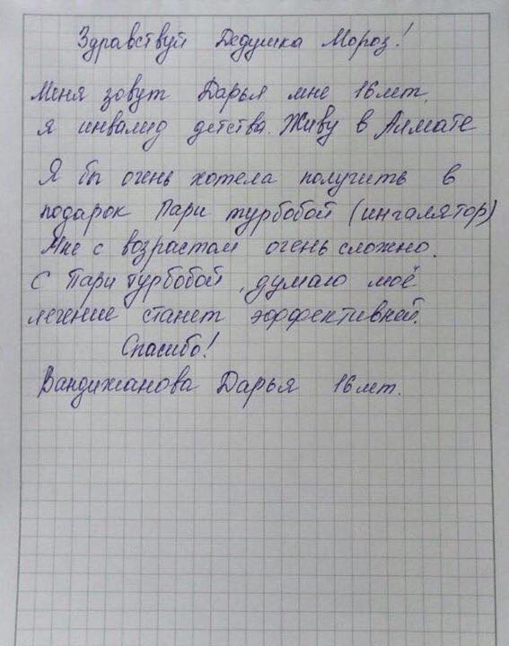 За четырехлетнего Нурберена послание Деду Морозу также написала мама. В качестве новогоднего подарка она попросила спортивную одежду.
