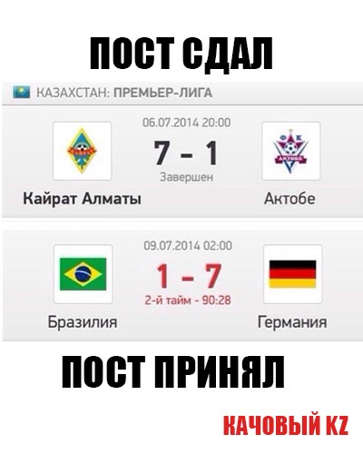 Мемы о разгромном поражении сборной Бразилии от Германии в полуфинальной игре на ЧМ-2014 взорвали Интернет. Tengrinews.kz сделал подборку лучших приколов по итогам прошедшего матча ЧМ-2014.