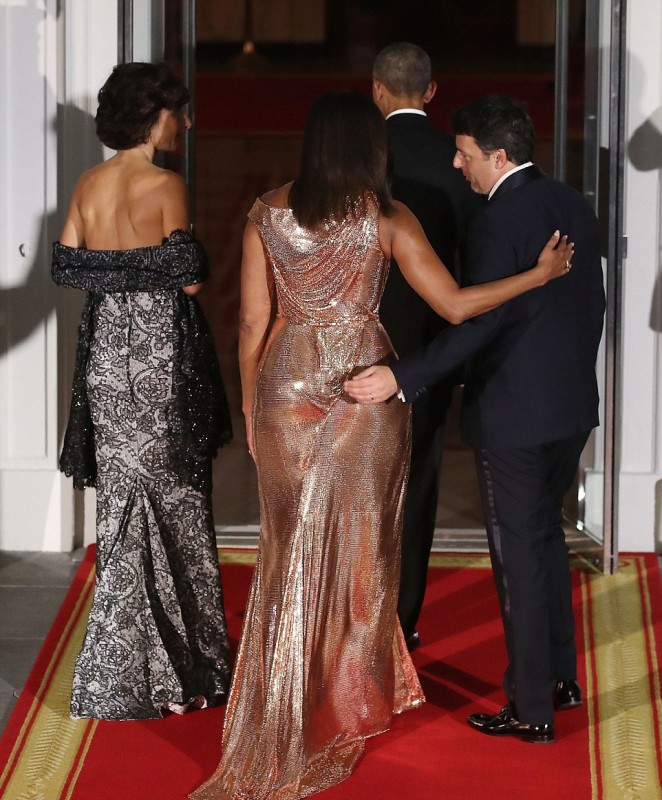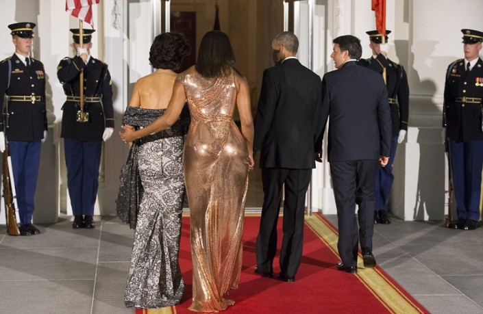Впрочем, наибольшее внимание в этот вечер привлекла Мишель Обама. Она появилась перед гостями в ослепительном платье от Versace оттенка розового золота. Модель получила название Flotus. Наряд с ассиметричным кроем "на одно плечо" и сложными драпировками из ткани с металлизированной фактурой напоминал жидкое золото, струящееся вдоль тела.