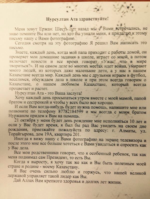 "А 21 октября сыну исполнилось десять лет. Перед этим мы обсуждали, как будем отмечать, каких друзей пригласим - одноклассников, соседей. И тут Ержан спрашивает: "Папа, а давай Президента пригласим на мой день рождения, что для этого нужно сделать?" Ты своих друзей как зовешь? Пригласительный отправляешь, вот и ему напиши", - ответил я. Ержан с нашим старшим сыном Нуржаном убежали в детскую и минут через 40 принесли мне письмо. Я удивился. На следующий день мы вместе отправились на "Казпочту", Ержан подписал: Президенту лично в руки", - пояснил Бауржан Исабаев.