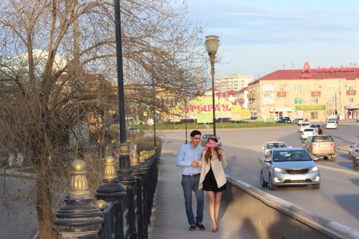 Он привез ее к Центральному мосту города Атырау и только тогда развязал глаза, чтобы она могла увидеть внизу огромное сердце, выстроенное из белоснежных машин специально для нее. На глазах у всех он вручил девушке роскошный букет, встал на одно колено и предложил ей руку и сердце.
