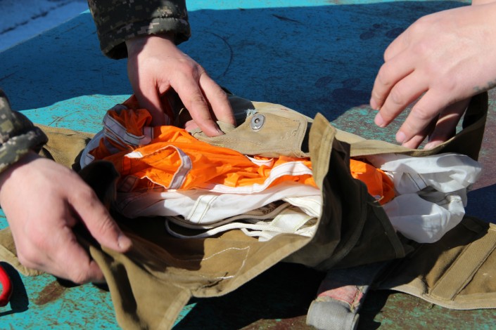 Прежде чем приступить к тренировке по наземным элементам прыжка, нужно внимательно ознакомиться с мерами безопасности и запомнить их. Главное - не впадать в панику, говорят десантники. В момент отделения от вертолета парашютисту нужно сложиться "каплей" - голову опустить к груди, правая рука на кольце парашюта, вторая в области живота. Важно также, чтобы ноги были собраны вместе и согнуты в коленях, чтобы не травмировать их в момент столкновения с землей, объясняют они.