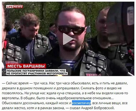 Пользователи социальных сетей высмеяли членов байкерского клуба "Ночные волки" из-за слов одного из мотоциклистов о том, что на границе с Польшей пограничники "обыскивали тщательно, каждый носок и косметичку". Фразу о "косметичке" неосторожно сказал байкер Андрей Бобровский в интервью телеканале Life News.