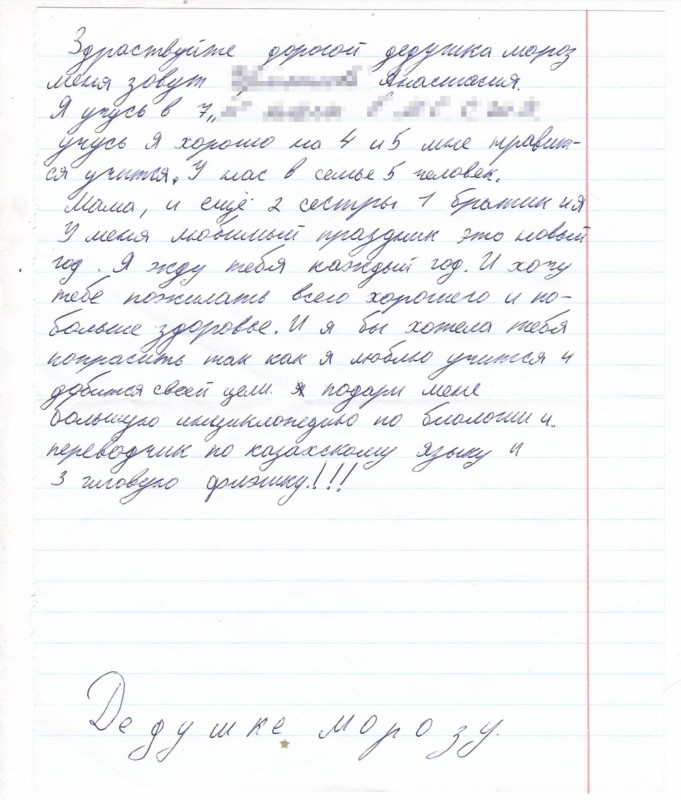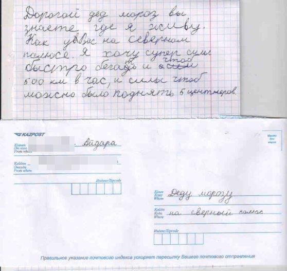 20 декабря завершился прием писем по новогодней акции "Напиши письмо Деду Морозу" от "Казпочты". В этом году было получено более десяти тысяч писем. По данным пресс-службы компании, большинство детей просят Деда Мороза подарить им смартфоны, планшеты и другие новомодные гаджеты. Но есть и письма, где школьники просят в подарок здоровье для мамы, книги или суперсилу. Редакция Tengrinews.kz собрала несколько трогательных посланий Деду Морозу.