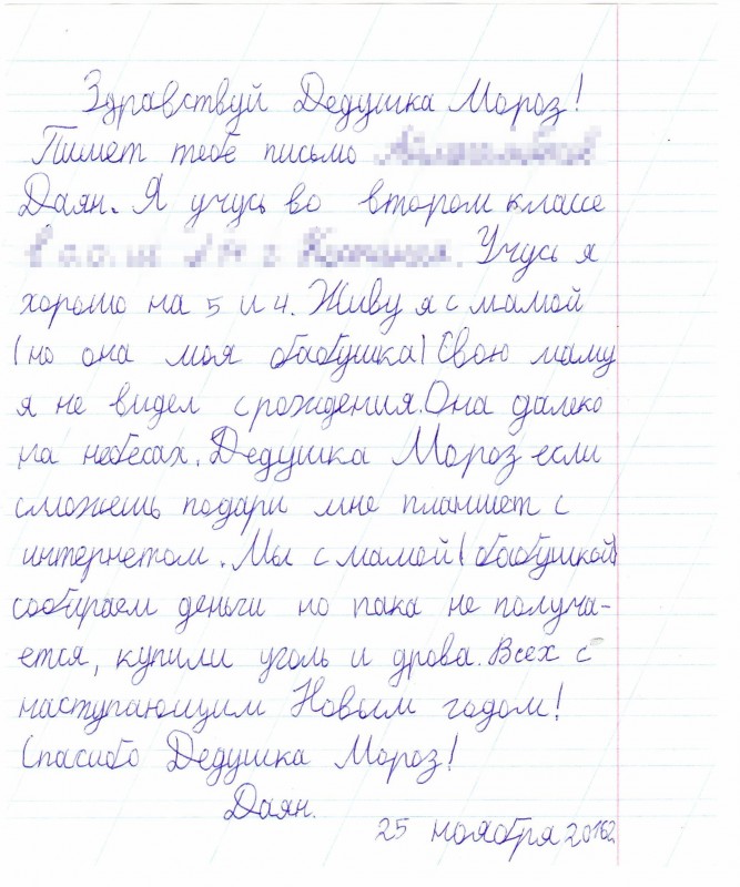 Мальчик по имени Даян просит Деда Мороза подарить им с бабушкой планшет с интернетом, так как у них не получается накопить самим на гаджет.