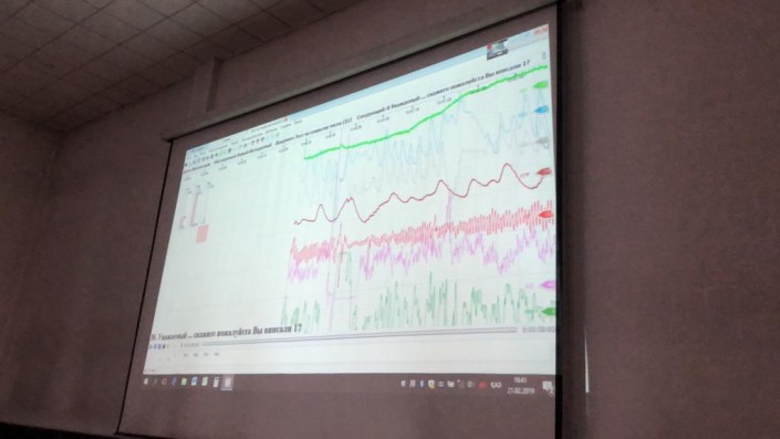 Через проектор на занавес в глубине сцены выводится изображение с ноутбука, всего шесть графиков. Внимание зала сосредоточено на яркой красной линии, расположенной посередине - это данные с тонометра. В зале слышен одобряющий шепот, когда испытуемый подполковник Руслан Утепов на вопрос про цифру 4 отвечает "нет", а линия особенно не колеблется. Задание повторяют еще дважды, только теперь вопрос про цифру 4 задают не по порядку.